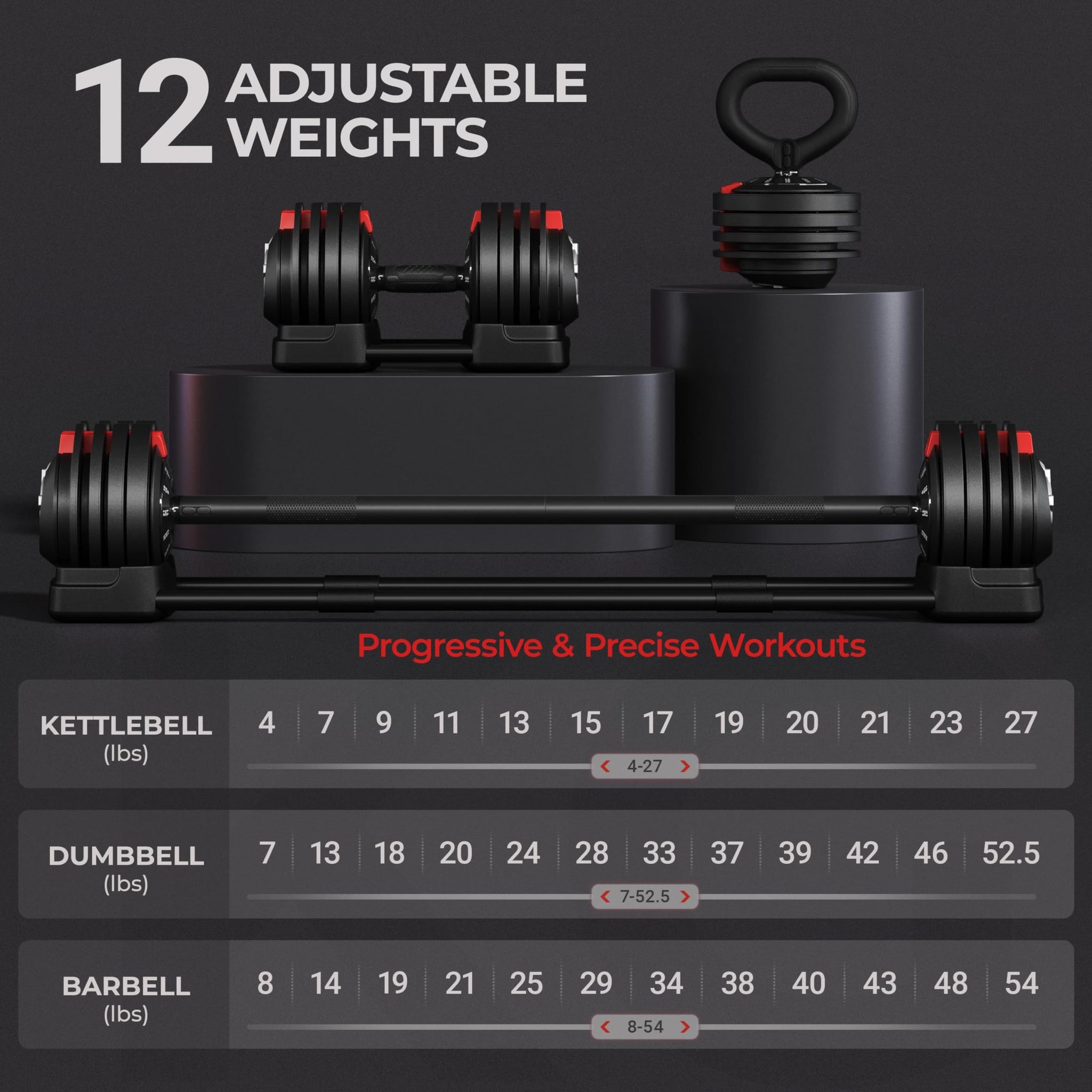 - 🏋️♂️3-in-1: Dumbbell, Kettlebell, Barbell: This workout equipment smartly combines dumbbell, kettlebell, and barbell into 1 versatile free weight set. Offering 12 weight variations in each mode, ranging from 7 lb to 52.5 lb for the dumbbell, 8 lb to 54 lb for the barbell, and 4 lb to 27 lb for the kettlebell, it opens up a vast array of possibilities for free weight exercises.