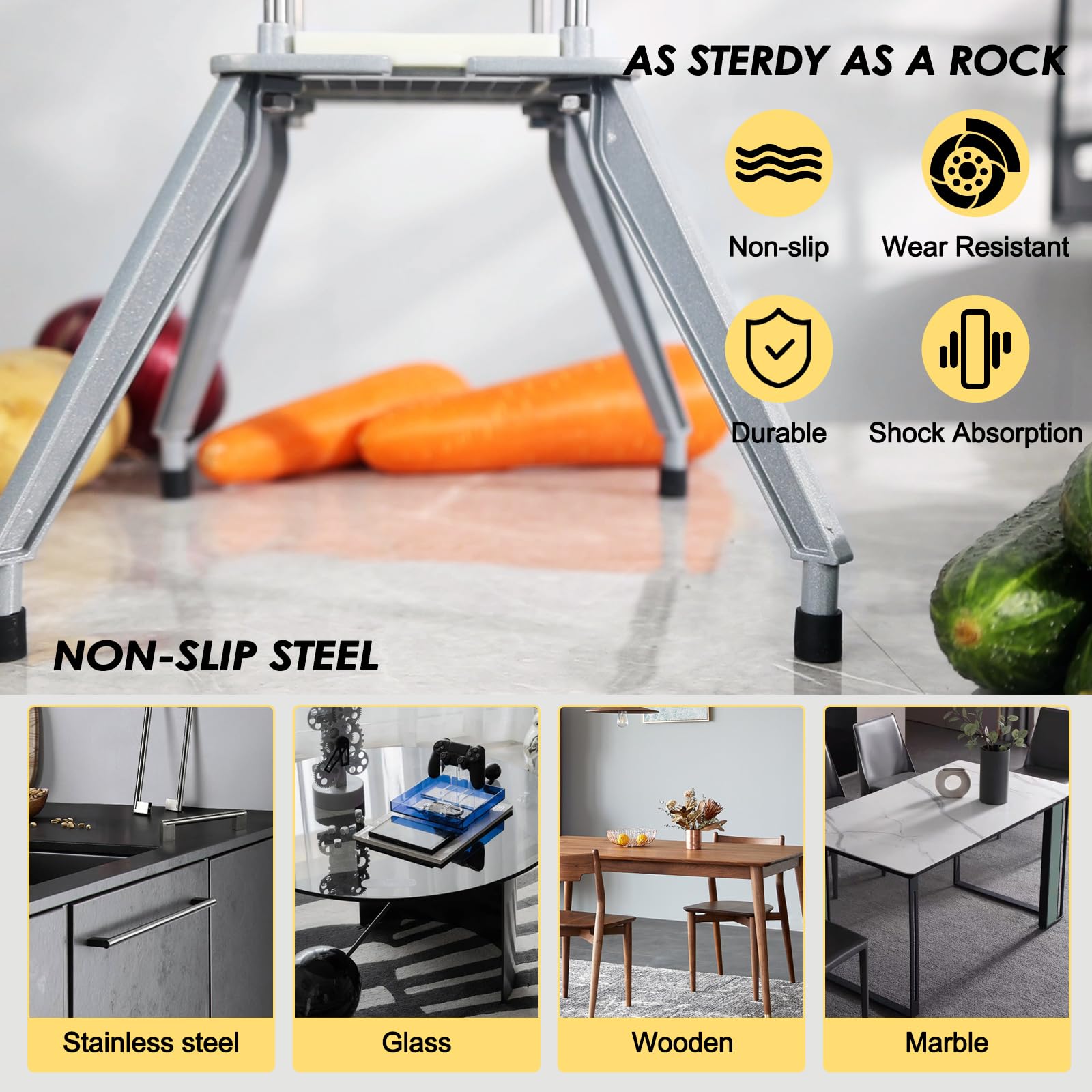 - HIGH QUALITY MATERIAL: Our professional potato cutter for french fries utilizes top-grade materials for durability and safety. The body is made of heavy-duty stainless steel, ensuring corrosion resistance. The load-bearing bracket structure is crafted from cast-aluminum, providing durability without adding excess weight. The Food grade stainless steel blades ensure can ensure food security and your health