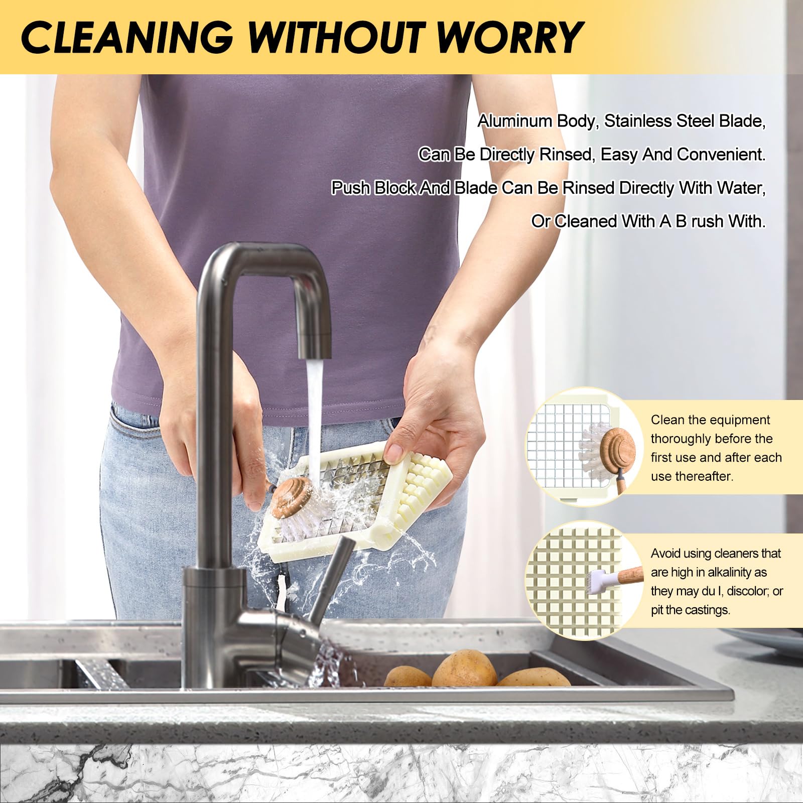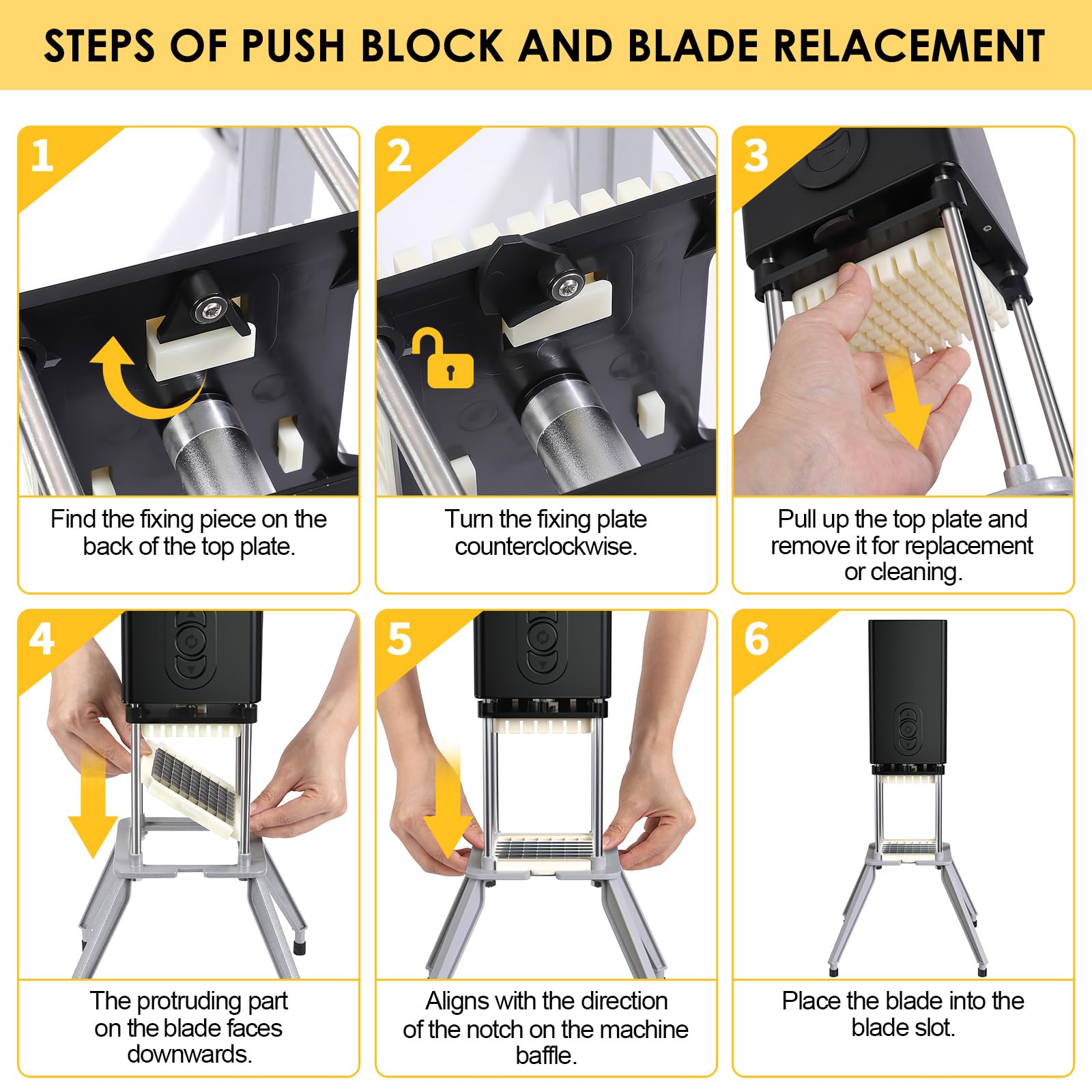- ELEVEATED BASE: This electric vegetable potato slicer is equipped with four support legs, ensuring stability during operation. The sturdy base allows you to place a food tray underneath to collect the diced vegetables or fruits. Both the blade and push block are removable and washable, please don't wash it directly by hand