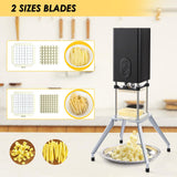- TWO SIZES OF BLADES: No need to cut potatoes into quarters or halves, this vertical french fries cutter machine is large enough to cut most potatoes and other vegetables. Cuts the entire potato in one go, even meet your commercial use, easy make and enjoy Michelin star flavor at home. Note that the blade is sharp, never touch the side of the blade with your hands