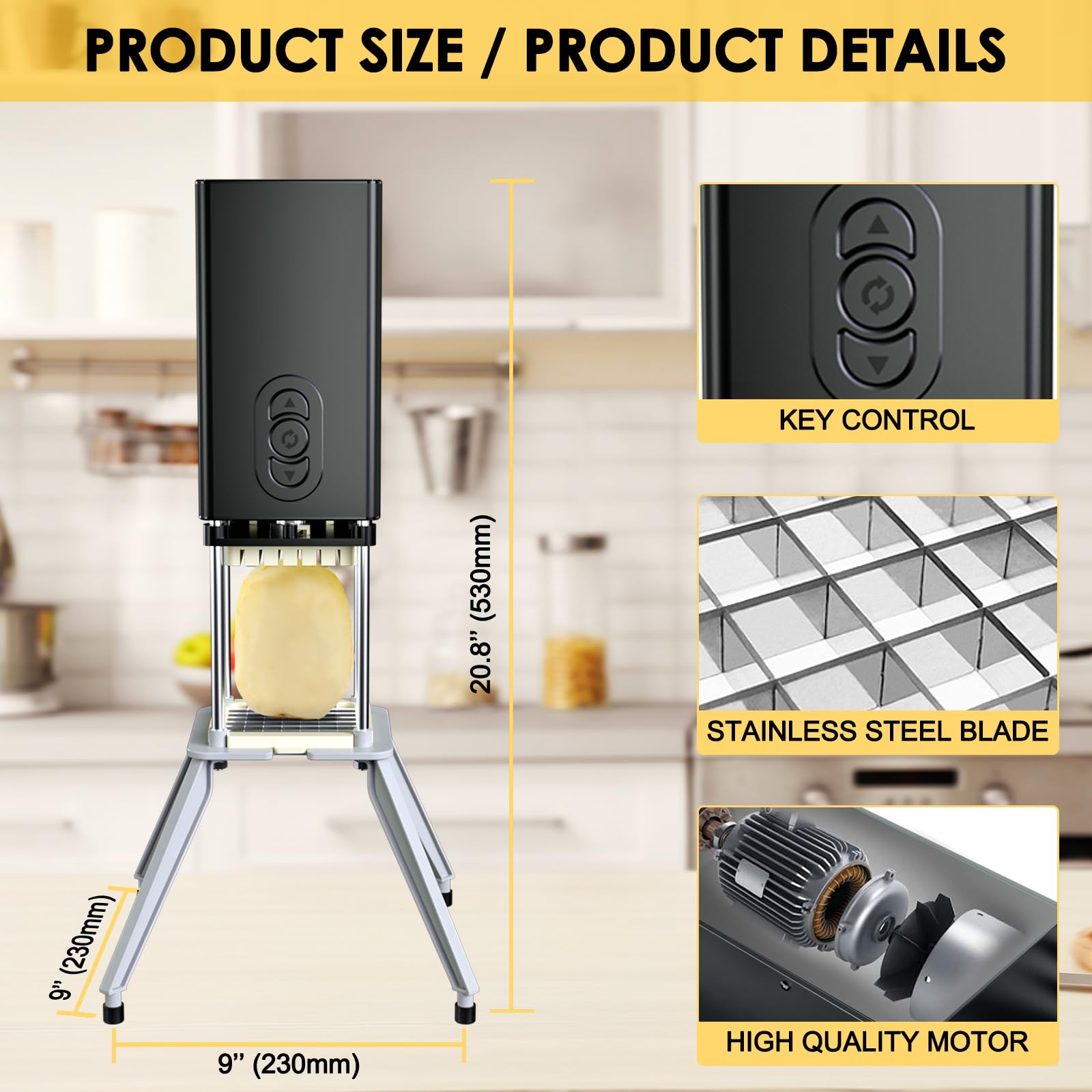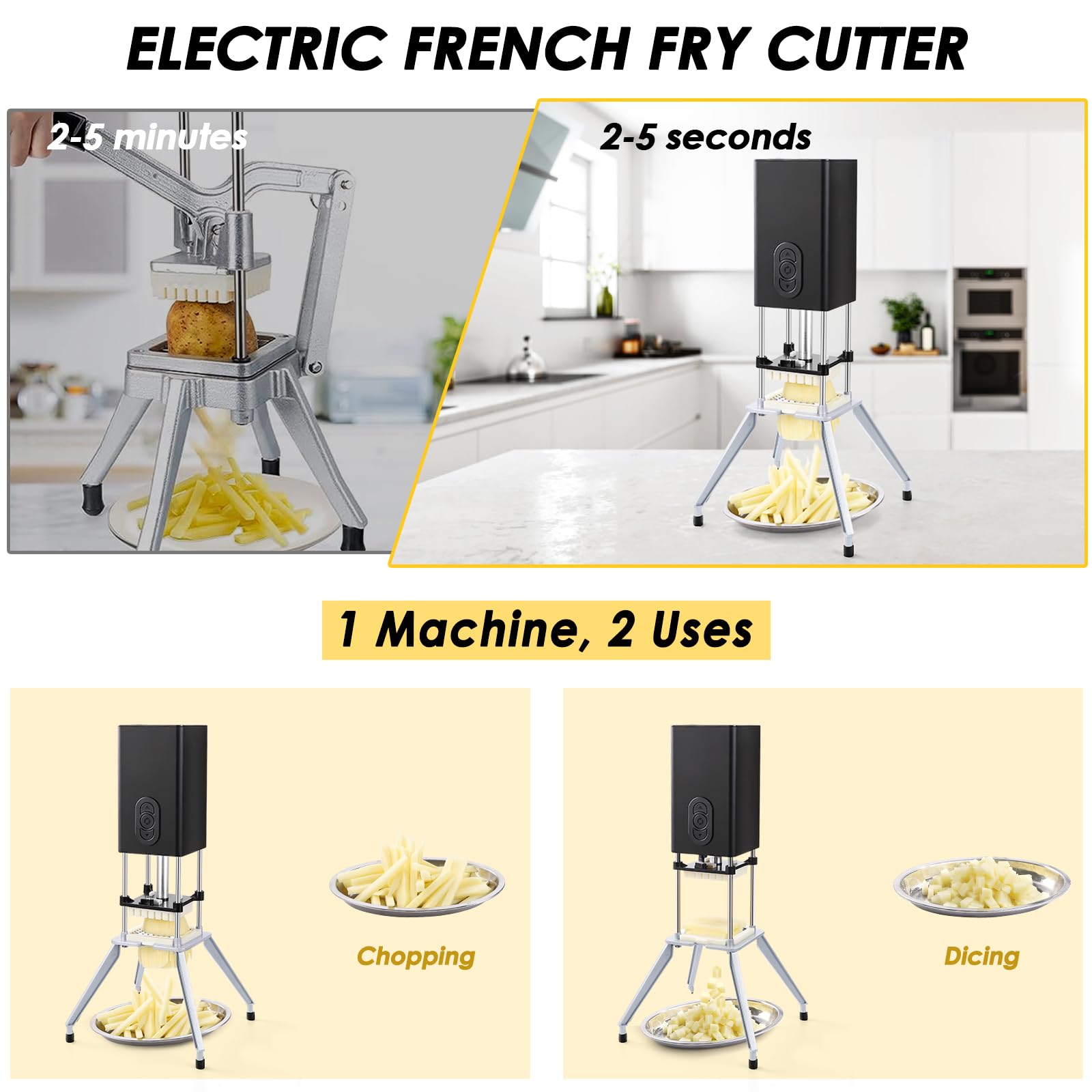 - ELECTRIC FRENCH FRY CUTTER: This electric french fry cutter is powered by electricity, so all you need to do is plug it into an outlet and use it, which is much more time-saving, energy-saving and efficient than traditional manual vegetable slicer. This versatile kitchen gadget cuts potatoes into 1/2-inch or 3/8-inch fries in seconds, making it ideal for family members suffering from arthritis and sore arms
