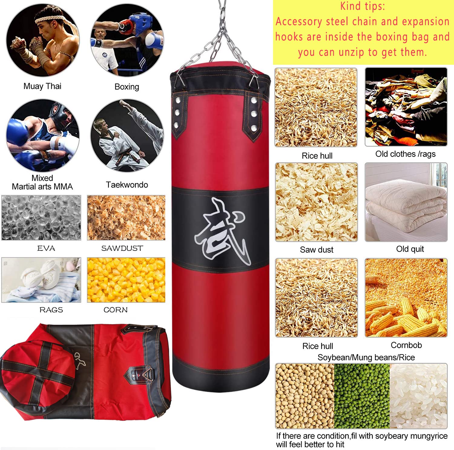 • 【WHAT YOU WILL GET】: This punching bag set includes 1 x empty punching bag, 1 x 4-pannel steel chain, 1 x connecting carabiner, 1 x boxing bag hanger, 1 x expansion screw hook, 4 x expansion screw, 2 x Wrist band. It's the ideal choice for your family or kids to boxing and do Martial Arts, Muay Thai, Karate, Taekwondo, etc. workouts